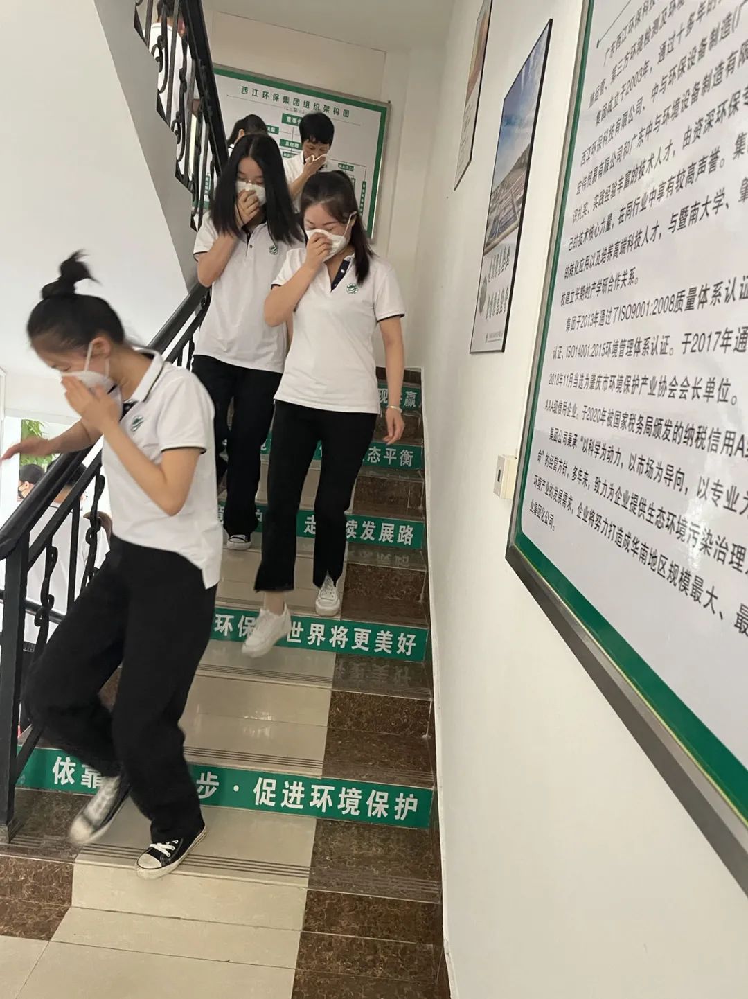 当拉响消防警报,公司全体员工根据各自所在的位置寻找最近的消防逃生通道,用湿毛巾捂住口鼻,弓腰靠右有序迅速撤离到安全地带。